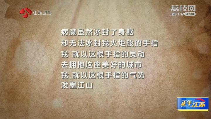 “病魔虽然冰封了身躯,却无法冰封我火炬般的手指。我,就以这根手指的灵动,去拥抱这座美好的城市。我,就以这根手指的气势,泼墨江山……”