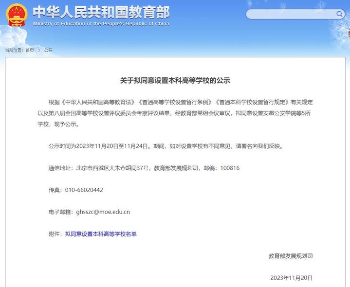 央视网消息:教育部发展规划司11月20日消息,根据《中华人民共和国高等教育法》《普通高等学校设置暂行条例》《普通本科学校设置暂行规定》有关规定以及第八届全国高等学校设置评议委员会考察评议结果,经教育部党组会议审议,拟同意设置安徽公安学院等5所学校,现予公示。公示时间为2023年11月20日至11月24日。
