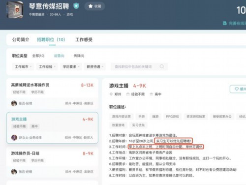 在网上搜索该公司,可以看到不少招聘信息。在BOSS直聘网站上,该公司发布了10条招聘信息。其中招聘“游戏主播”的信息显示,薪资4000-9000元、经验不限,要求会玩原神或者逆水寒游戏为最佳,招聘年龄上还注明“实习生可以优先招聘”。在工作时间上,该公司称“早上九点半上班,上班时间自由分配,以白班为主……”
