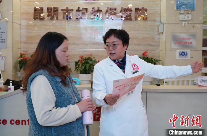 图为11月20日,昆明市妇幼保健院医生向民众介绍“新生儿出生即参保”情况。刘冉阳 摄