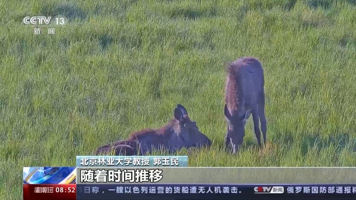 北京林业大学教授 郭玉民:雌驼鹿每年可以产1至2个幼崽,每年“六一”前后小驼鹿就出生了,随着时间推移,第二年就跟成年的雌性驼鹿体形差不多了。它的生长速度比较快,同时又没有更多的干扰,我们国家驼鹿的种群数量在迅速地增长。