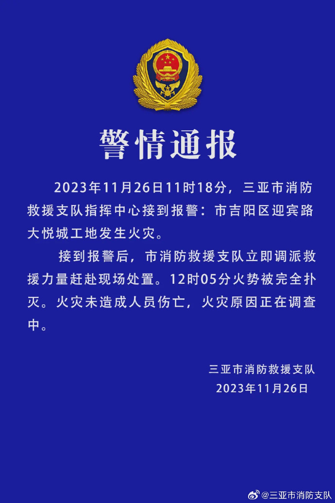 荔枝新闻讯 据“三亚消防”微博消息,11月26日11时18分,三亚市消防救援支队指挥中心接到报警:三亚市吉阳区迎宾路大悦城工地发生火灾。接到报警后,三亚市消防救援支队立即调派救援力量赶赴现场处置。12时05分火势被完全扑灭。火灾未造成人员伤亡,火灾原因正在调查中。