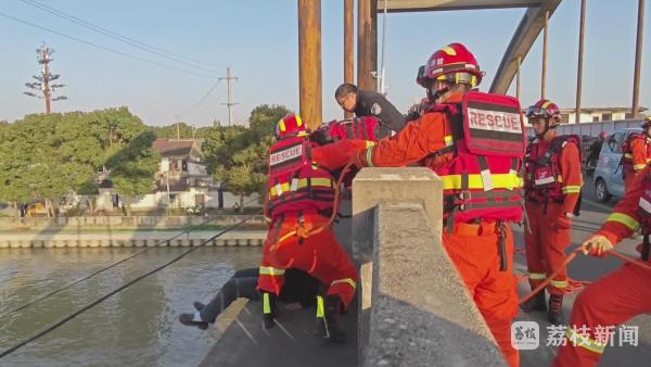 消防员到场后了解到,现场是一名中年女子坐在桥边护栏外,身体大部分位于桥外面,桥下十几米处为一条运河,水流湍急,不时有各种船只经过,情况十分紧急。消防迅速展开营救, 一名消防员在穿戴好防护装备和救生衣,系好安全绳后,悄悄地从女子背后地护栏爬出,即将接触到女子时,消防员配合现场民警一同飞扑,眼疾手快地抓住了女子。女子十分抗拒,不停扭动身体躲避消防员和民警的救援,此时,岸边的消防员与民警合力,协助救援人员将女子抬至桥上。女子到桥上后,情绪仍旧十分激动,后被带至派出所进行进一步调查。