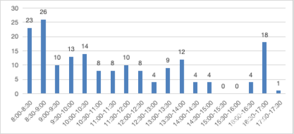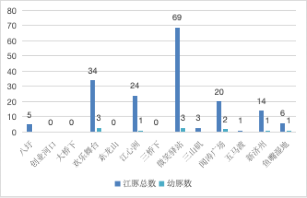长江江豚观测结果显示,江豚最为活跃的时间段为08:00-09:00,日落前的16:30-17:00 也较为活跃。江豚在上午的目击次数大于下午,下午15:00-16:30各观测点均无江豚目击记录。总体上,清晨和黄昏在长江南京市区段目击到江豚的次数更多。
