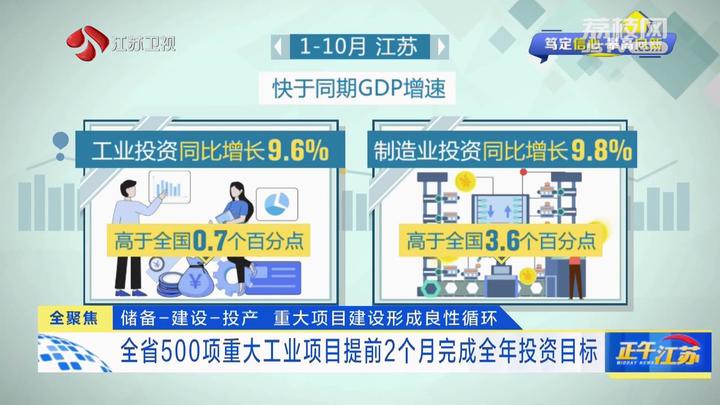 作为制造业大省,制造业投资在江苏投资版图中具有重要地位。1-10月,江苏工业投资增长9.6%,其中,制造业投资同比增长9.8%,分别高于全国0.7和3.6个百分点,也快于同期GDP增速,特别是重大工业项目成为支撑当下经济复苏、引领未来转型升级的关键动能。