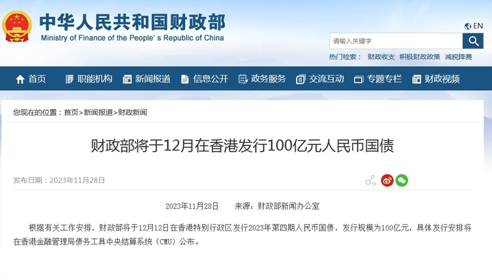 据财政部网站28日消息,根据有关工作安排,财政部将于12月12日在香港特别行政区发行2023年第四期人民币国债,发行规模为100亿元,具体发行安排将在香港金融管理局债务工具中央结算系统(CMU)公布。