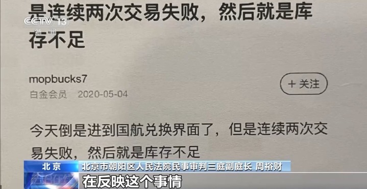 北京市朝阳区人民法院民事审判三庭副庭长 周裕财:原告是提交的这论坛截图,来证明当时确实有很多的消费者在反映这个事情。同时,当然被告就是提交的证据,就是内部系统里面能够记录当时有人兑换成功了。