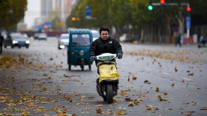 2023年11月29日,河南郑州,初冬的市区气温骤降,骑车的市民裹得严实。IC photo 图