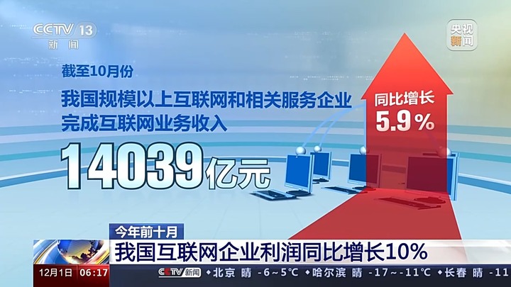 截至10月份,我国规模以上互联网和相关服务企业完成互联网业务收入14039亿元,同比增长5.9%;实现利润总额1074亿元,同比增长10%;互联网企业营业成本同比增长9.8%,增速较前三季度提升2.8个百分点。