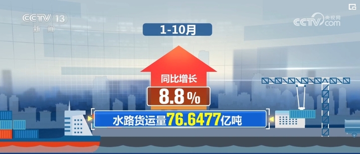 货运方面,1—10月,我国公路货运量332.9567亿吨,同比增长8.2%;水路货运量达76.6477亿吨,同比增长8.8%。