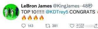 詹姆斯第一时间更新社媒写道:“历史前十!!!!!@杜兰特 恭喜。”
