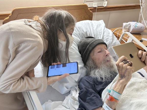 7月2日,103岁的美国老人林恩·柏龄(右)在其家附近的康养中心病床上,以视频连线的方式“重回”了他魂牵梦绕87年的鼓岭。