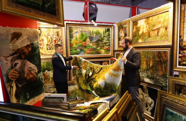 11月10日,在第六届进博会上,一名参观者在一家伊朗手工挂毯展位上查看一款风景画挂毯。(新华社记者方喆摄)