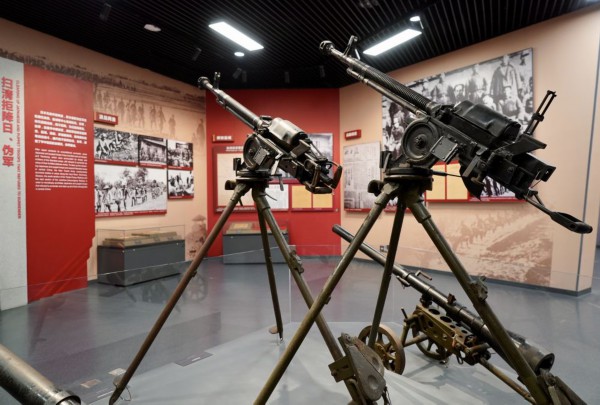 ↑ 观众在盐城新四军纪念馆内参观枪支等实物展品(2011年5月26日摄)。