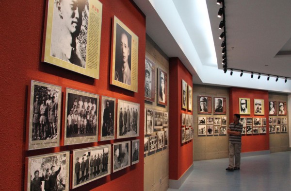 ↑ 观众在盐城新四军纪念馆新建的人物馆内浏览图片资料(2011年5月26日摄)。
