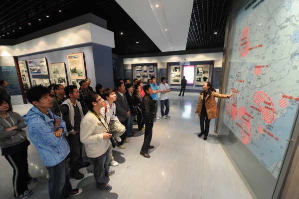 ↑ 在盐城新四军纪念馆内,讲解员在向观众介绍南方红军游击队整编为新四军示意图(2011年5月26日摄)。
