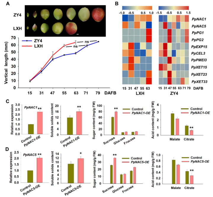 鉴于被子植物有果实而裸子植物不形成果实这一事实,研究团队推测NAC1和NAC5在果实发育中扮演着重要角色。上述研究结果为桃果实成熟期以及早熟桃风味品质的遗传改良提供了理论与技术支撑。