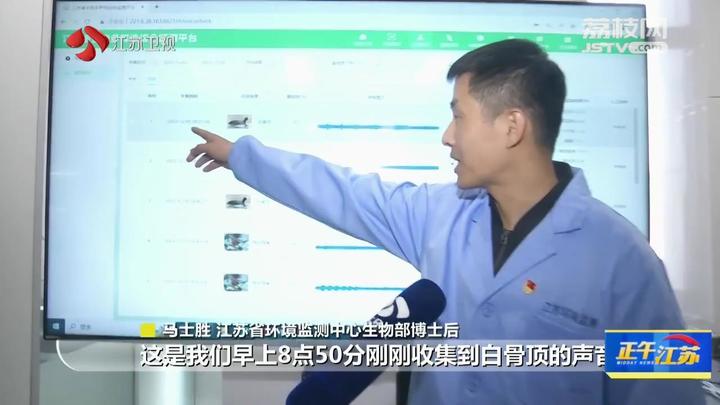 江苏省环境监测中心博士后马士胜介绍,现场收集到的声音会进入江苏省生物多样性监测平台。这是早上8点50分刚刚收集到白骨顶声音,可以清楚地听到,前面四个波峰是白骨顶的叫声,后面是喜鹊的声音。因为鸟的叫声是混合的,这个系统会识别多种鸟,再通过人工审核,留下来最准确的声音结果。