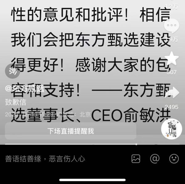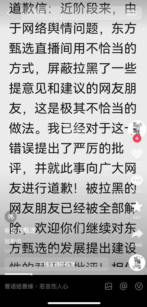 荔枝新闻讯 16日,俞敏洪通过东方甄选直播间发致歉信称:近阶段来,由于网络舆情问题,东方甄选直播间用不恰当的方式,屏蔽拉黑了一些提意见和建议的网友朋友,这是极其不恰当的做法。我已经对于这一错误提出了严厉的批评,并就此事向广大网友进行道歉!被拉黑的网友朋友已经被全部解除,欢迎你们继续对东方甄选的发展提出建设性的意见和批评。