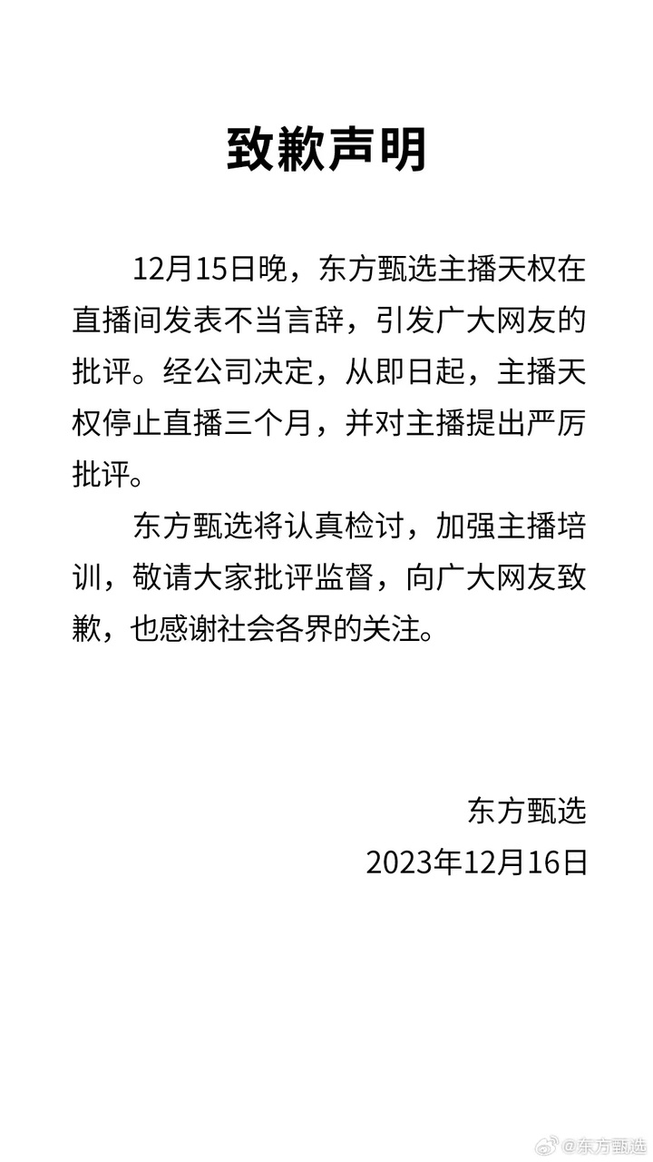 同日,东方甄选发布致歉声明称:12月15日晚,东方甄选主播天权在直播间发表不当言辞,引发广大网友的批评。经公司决定,从即日起,主播天权停止直播三个月,并对主播提出严厉批评。东方甄选将认真检讨,加强主播培训,敬请大家批评监督,向广大网友致歉,也感谢社会各界的关注。