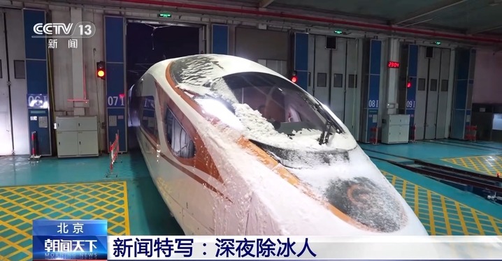 持续的低温、雨雪、冰冻天气,不仅影响了列车运行,也增加了检修工作的难度。负责京沪、京广高铁动车检修任务的北京南动车所里,检修员又增加了一个新身份——除冰人,他们要让穿行风雪的高铁列车温暖入库、安全体检。