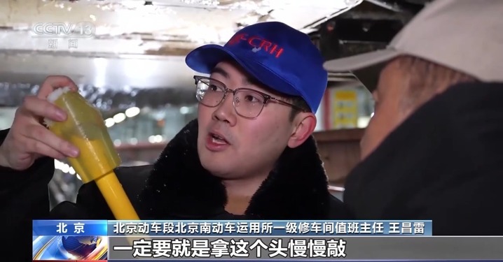 北京动车段北京南动车运用所一级修车间值班主任 王昌雷:最难的在于风管的连接处,如果用蛮力干,容易对连接处造成损伤。工具是橡胶的,就是为了保护车下的机械部件,一定要慢慢敲。