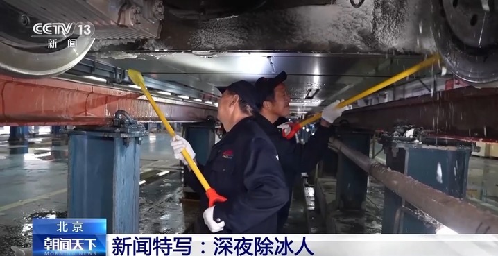 持续的低温、雨雪、冰冻天气,不仅影响了列车运行,也增加了检修工作的难度。负责京沪、京广高铁动车检修任务的北京南动车所里,检修员又增加了一个新身份——除冰人,他们要让穿行风雪的高铁列车温暖入库、安全体检。