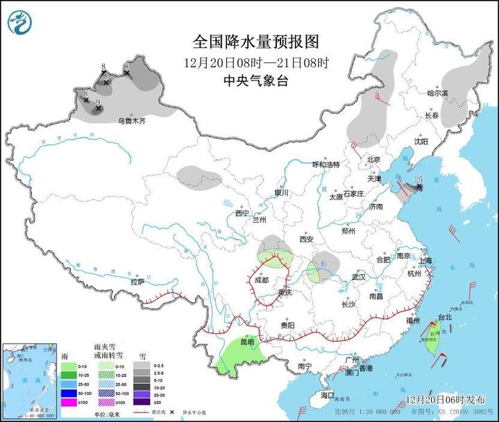 12月20日08时至21日08时,内蒙古东部、东北地区东部、新疆北部、甘肃河西、山东半岛、湖北西部等地部分地区有小雪或雨夹雪,其中,新疆北疆北部和伊犁河谷、山东半岛北部等地部分地区有中到大雪,局地有暴雪或大暴雪(20~25毫米)。内蒙古东南部、河北北部、山东半岛等地部分地区有4~6级风。渤海、渤海海峡、黄海、东海海域、台湾海峡、台湾以东洋面、巴士海峡、南海大部海域、北部湾将有7~8级、阵风9~10级的偏北到东北风(见图3)。