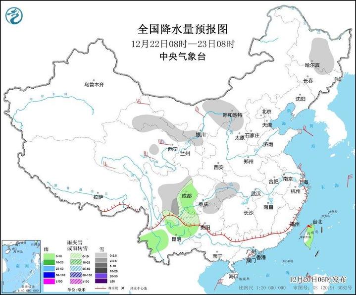 12月22日08时至23日08时,内蒙古西部、黑龙江中部、青海北部和东部、甘肃河西、宁夏中北部、陕西北部、山西北部、湖北西南部、川西高原等地部分地区有小雪或雨夹雪。四川盆地、贵州西部、云南西部、台湾岛大部等地部分地区有小雨。内蒙古西北部、青海南部、甘肃河西等地部分地区有4~6级风,阵风可达6~7级风(见图5)。