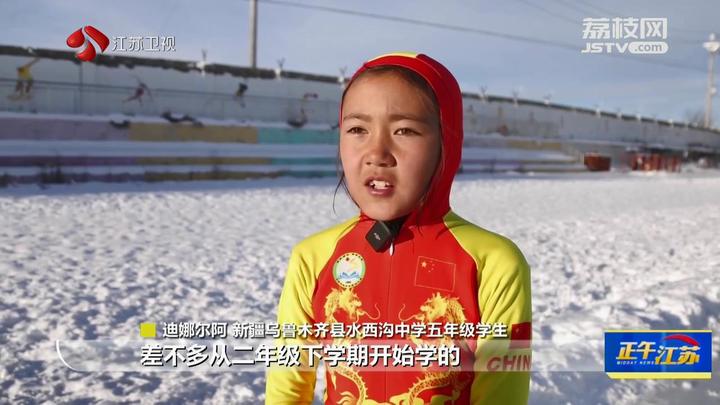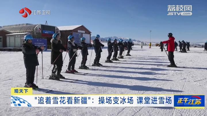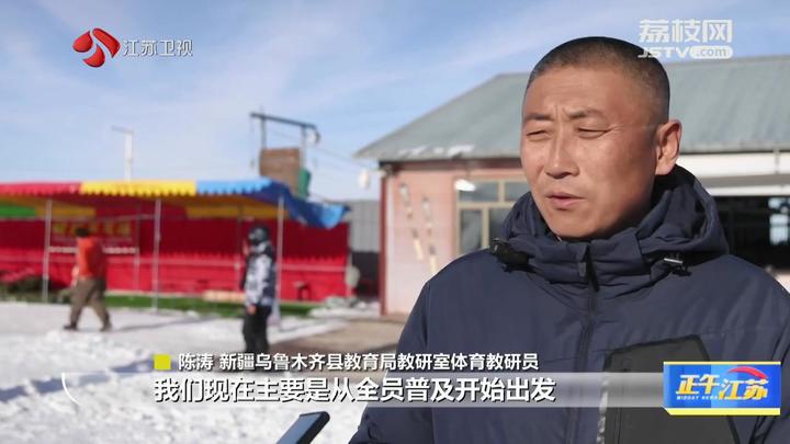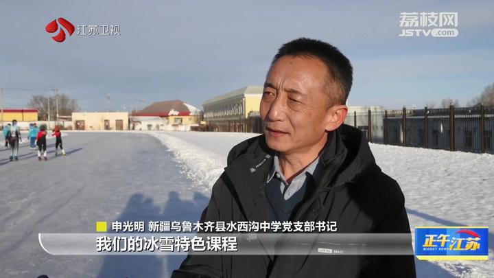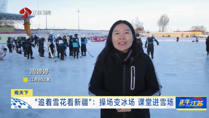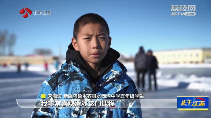 江苏台记者周婷婷报道:“我现在是在新疆乌鲁木齐县水西沟中学的体育场,现在孩子们正在这片冰场上上课,可以看到有的孩子在打冰球,有的孩子在玩冰爬犁,可以说是非常非常的热闹。”