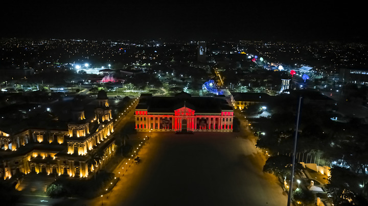 2022年1月31日,尼加拉瓜首都马那瓜市中心标志性建筑国家宫点亮“中国红”(无人机照片)。