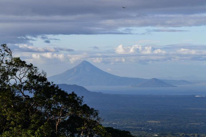 这是在尼加拉瓜首都马那瓜附近拍摄的马那瓜湖及远处的莫莫通博火山。
