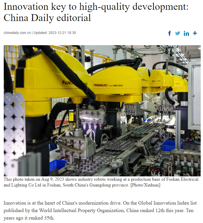 创新是中国现代化建设的核心。近日,世界知识产权组织发布《2023年全球创新指数》报告,中国排名第12位;十年前,中国仅排名第35位。