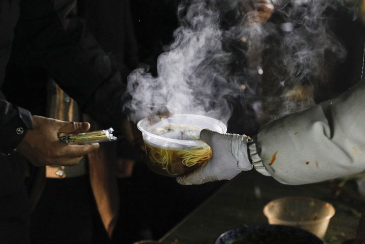 这几天,马忠明的爱心牛肉面摊前人头攒动,他也没有统计过到底做出了多少碗面。“我们的拉面师傅胳膊和手都肿了,大家都没有怎么睡过囫囵觉,只要有排队的,我们就不打烊”。