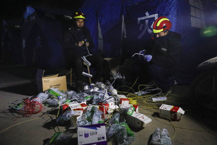 12月19日晚,在积石山县大河家镇大河村安置点,国家电网工作人员在做通电前的准备。新华社记者方欣摄
