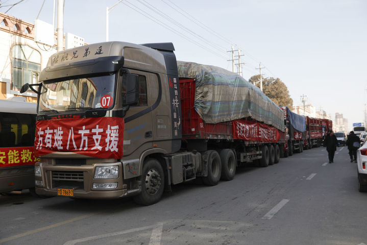 12月20日,在积石山县大河家镇大河村安置点外,救援物资等待卸货。新华社记者方欣摄