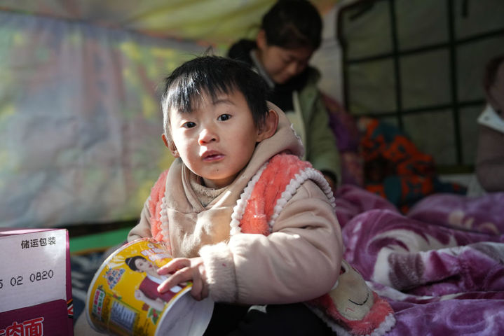 12月20日,在积石山县大河家镇陈家村安置点,小朋友在帐篷里拿着分发的泡面。新华社记者陈斌摄