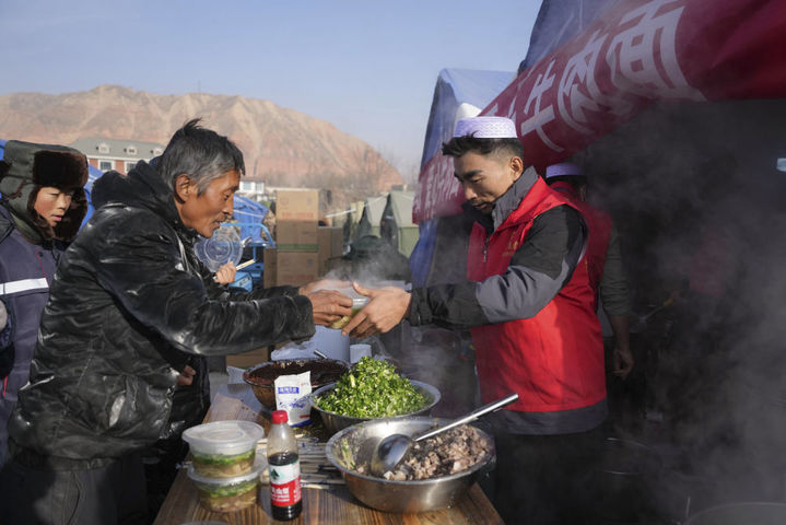 12月20日,在积石山县大河家镇大河村安置点,爱心企业给受灾群众提供免费牛肉面。新华社记者陈斌摄