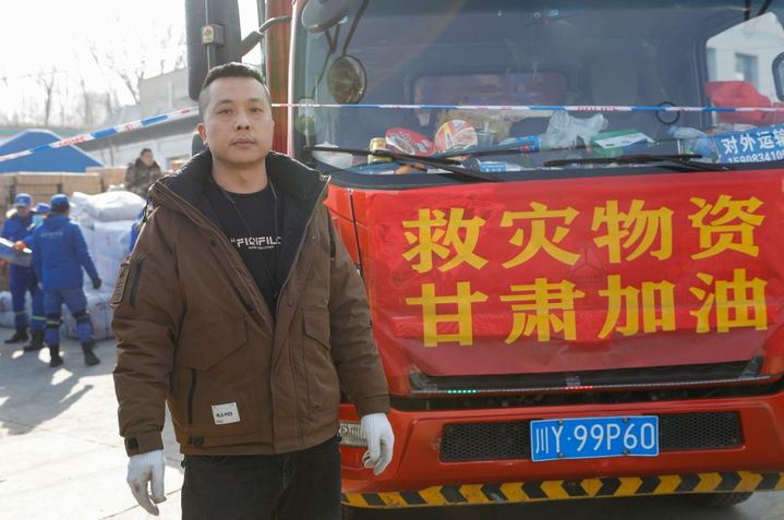 12月21日,34岁的卡车司机杜伟在运输救灾物资的卡车前。地震发生后,杜伟从四川省巴中市平昌县出发,带着爱心企业捐赠的600套御寒被服以及100箱方便面和矿泉水赶往灾区,历经约12小时车程,于21日下午到达积石山县大河家镇大河村安置点。新华社记者方欣摄