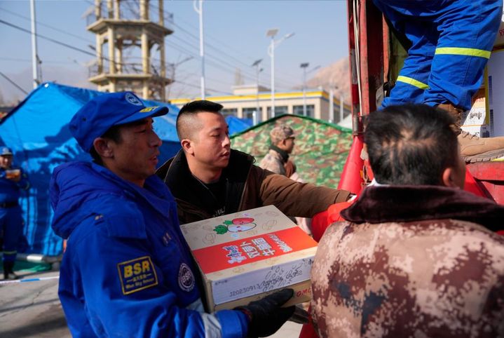12月19日,在甘肃临夏积石山县大河家镇大河村安置点,消防人员在搬运救援物资。新华社记者方欣摄