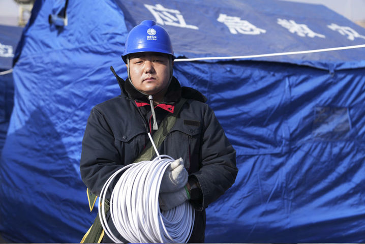 12月21日,26岁的国家电网临夏供电公司工作人员方小平在受灾群众临时安置点的帐篷外。地震发生后,方小平和同事第一时间赶赴灾区,为安置点的帐篷接通电源。截至21日中午,方小平已为240多顶帐篷通电。新华社记者陈斌摄