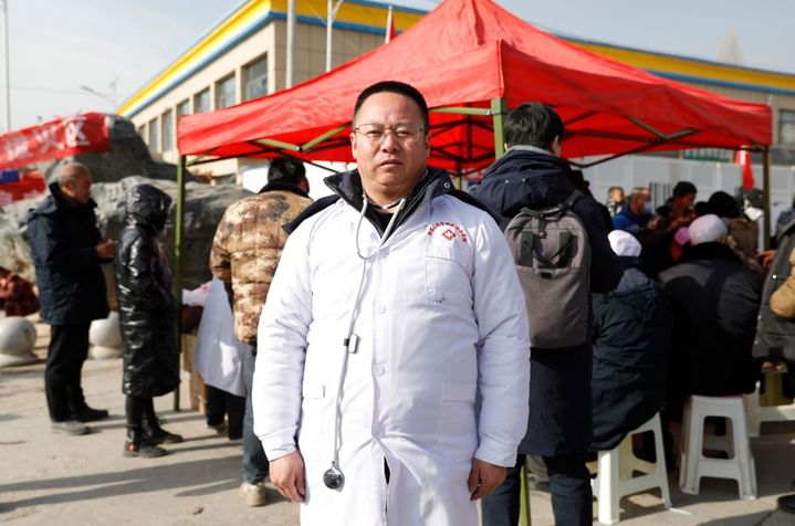 12月21日,39岁的积石山县中西医结合医院医生陶希明在受灾群众临时安置点的医疗救治处。震后,陶希明参与地震伤员转移和救治工作。21日,他来到积石山县大河家镇大河村安置点,为受灾群众接诊及配发药物。新华社记者方欣摄
