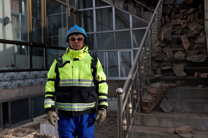 12月21日,36岁的河北保定蓝天救援队队员王楠在地震救援现场。12月20日17时左右,王楠和队友从保定出发,驱车近20个小时抵达灾区,这是他第一次参与大型地震救援。新华社记者方欣摄