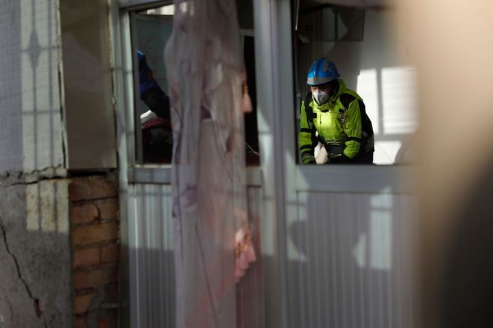 12月21日,王楠在积石山县大河家镇大河村帮助一户受灾严重的群众安全转移家中财物。新华社记者方欣摄