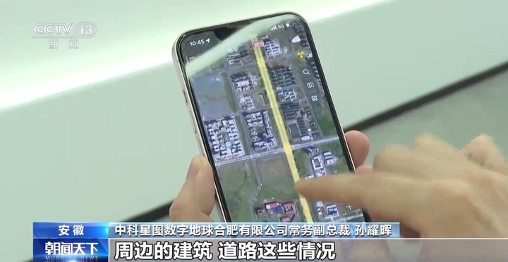 中科星图数字地球合肥有限公司常务副总裁 孙耀晖:这是我们最新的一个应用App,我们在这里就可以看到,从整个地球,我们可以定位到我们现在所在的位置,我们可以看到整个位置周边的建筑、道路这些情况,包括我们现在的天气情况。