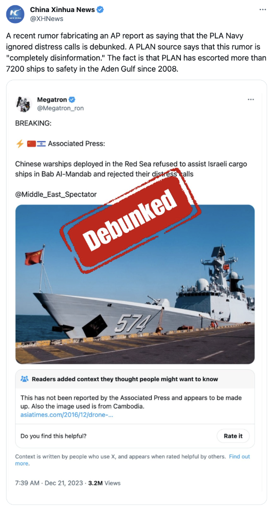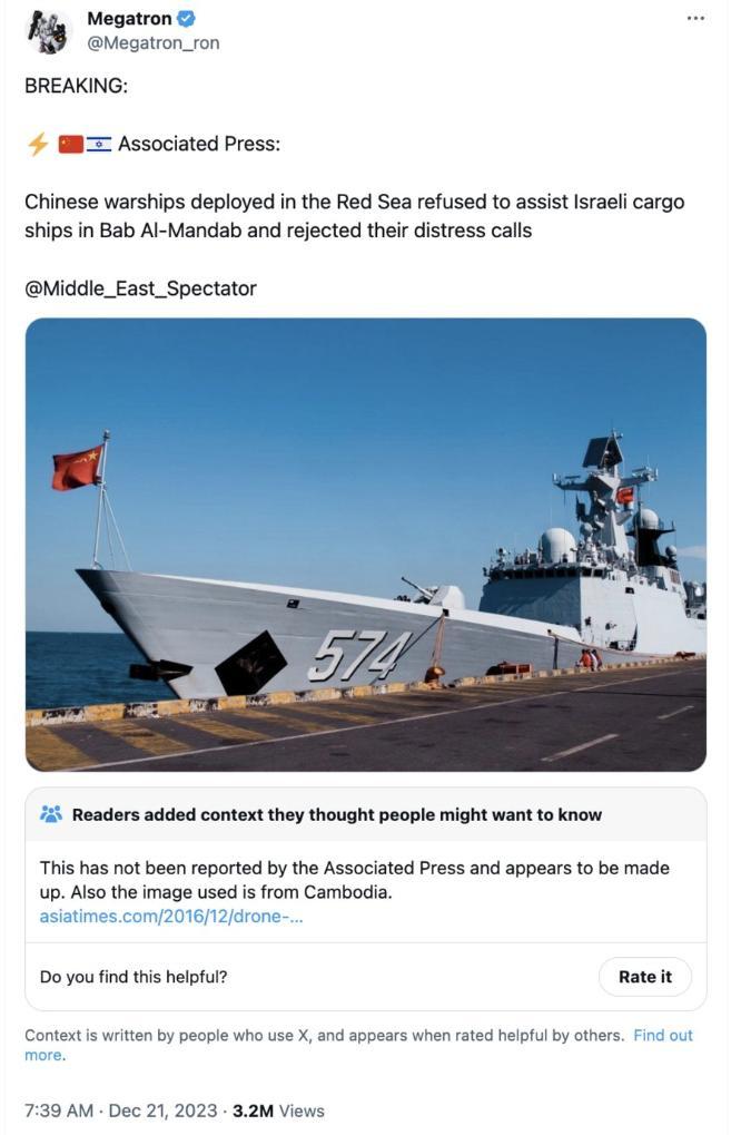 一个名为“Megatron”的拥有十多万“粉丝”的账号在社交平台“X”(原推特)上说:“美联社突发新闻!中国军舰在曼德海峡拒绝协助以色列货船,且无视他们的呼救。”贴文后还配了一张中国军舰的照片。