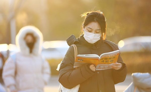 2023年12月23日,在山东省枣庄市实验小学考点,考生在考场外复习。 图片来源:视觉中国