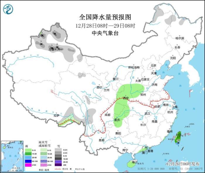 12月28日08时至29日08时,内蒙古东北部、黑龙江西北部、新疆北部、西藏东部等地部分地区有小雪或雨夹雪,其中,新疆北疆北部和沿天山地区等地部分地区有中到大雪(5~8毫米)。西北地区东部、华北南部、黄淮西部、西南地区东部、台湾岛等地部分地区有小到中雨,其中,台湾岛等地部分地区有大雨(25~40毫米)。青海西部部分地区有5~6级风(见图3)。