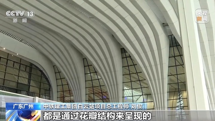 中铁建工集团白云站项目总工程师 刘俊:每一个花瓣钢结构的定位,包括曲线都不一样。施工工艺复杂,是本工程的特点及重难点之一,过程中我们通过运用BIM(建筑信息模型)技术、三维激光扫描技术等一系列数字化建造技术的运用,成功实现这个花瓣钢结构的精准定位和吊装。