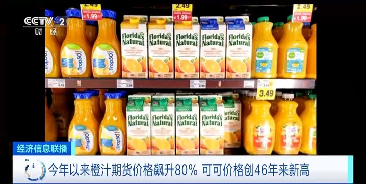 受极端天气事件和病虫害影响,美国佛罗里达州标志性作物柑橘产量下降,橙汁期货价格在11月底达到了历史最高水平。今年以来,橙汁期货价格已飙升了80%。可可主产区西非受到暴雨和真菌病的打击,产量严重下滑。作为巧克力的重要原料,可可价格今年迄今为止上涨了64%,价格创下46年来最高水平。本月中旬,罗布斯塔咖啡价格达到了15年来的最高。糖的价格今年以来上涨了13%,目前较9月创下的12年高点有所回落。